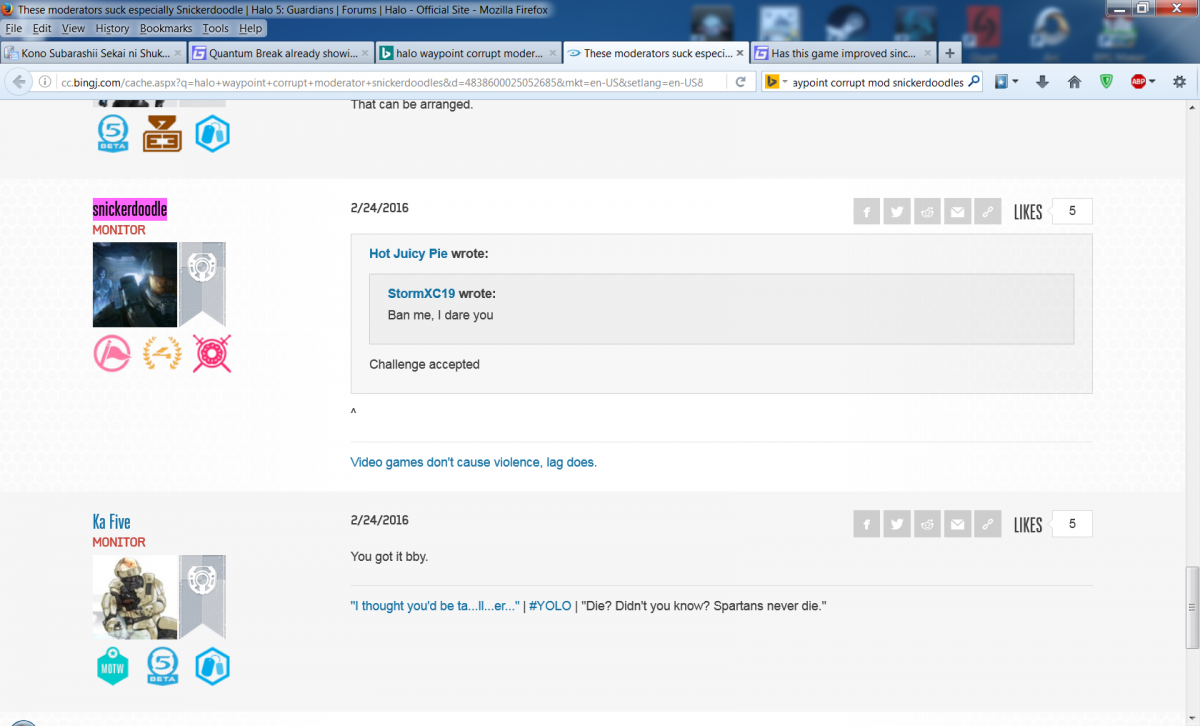 let me guess it was Snickerdoodles that banned you or Ka Five right? if so they dis same to me for exact same thing except they got my main gamertag suspended for 2 weeks from XBL and my offline guest/silver account perma banned from XBL which was the one i used on waypoint !!! im sharing a screenshot below of how these two operate they feed the trolls on waypoint and then ban the non trolls