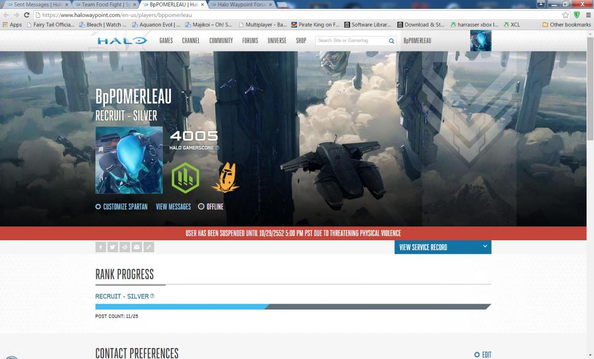 ok in october 2015 i created an account i commented on a thread where someone was getting trolled bad i was trying to defend the guy , i then got trolled a moderator fed into it and also bashed the opening poster so i reported the mod for trolling i then got a 24 suspension (false reports) by a mod in the same spartan squad (clan) as the mod i reported so i waited the 23 hours i log into waypoint to a permanent ban till the year 2552 for threatening violence (a false reason) i got no email of the waypoint suspension , then my xbox account both my offline silver (never was gold its a guest account) was permanently banned for same thing as waypoint and my primary (only one i use) was suspended same thing (harassment) for 14days ( i ended up changing the email address associated with the account and removing the old email also i changed the gamertag as well because i was recieving messages from 4 waypoint mods all are apart of the same spartan squad making threats etc on xbox live so i blocked all 4 of them) I knew waypoint was bad but that was an understatement !!!